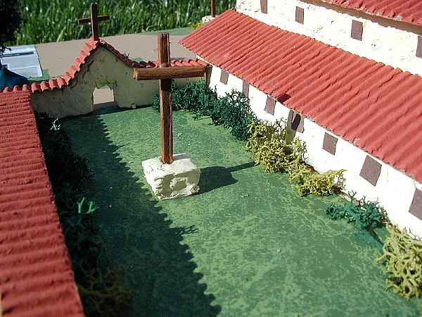 Mission Santa Clara has one very large cross in front of the church, and a smaller cross in the center of the cemetery. Wooden kitchen matches were used in this project. To make them stand upright, little bases of stryofoam were cut, although scupley bases could also be made. If you are going to use sculpey, insert the upright stick into the sculpey and bake before gluing on the cross piece.