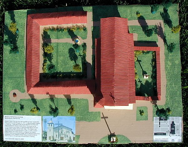 The mission is located in the center of Santa Clara University, and they happen to have a map of the mission area online. This has the current layout of the grounds, which includes part of the original buildings. As the mission has been used as a college, some modifications occurred over the years, but this map still gives valuable 'scale' information. All three of the books contained layouts of the grounds from the 1800's, although they were not identical.