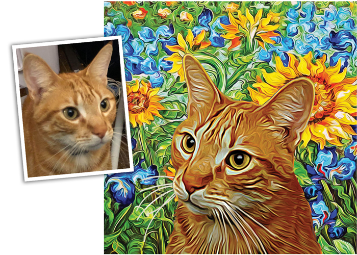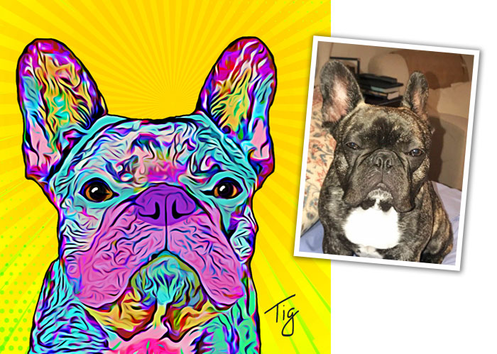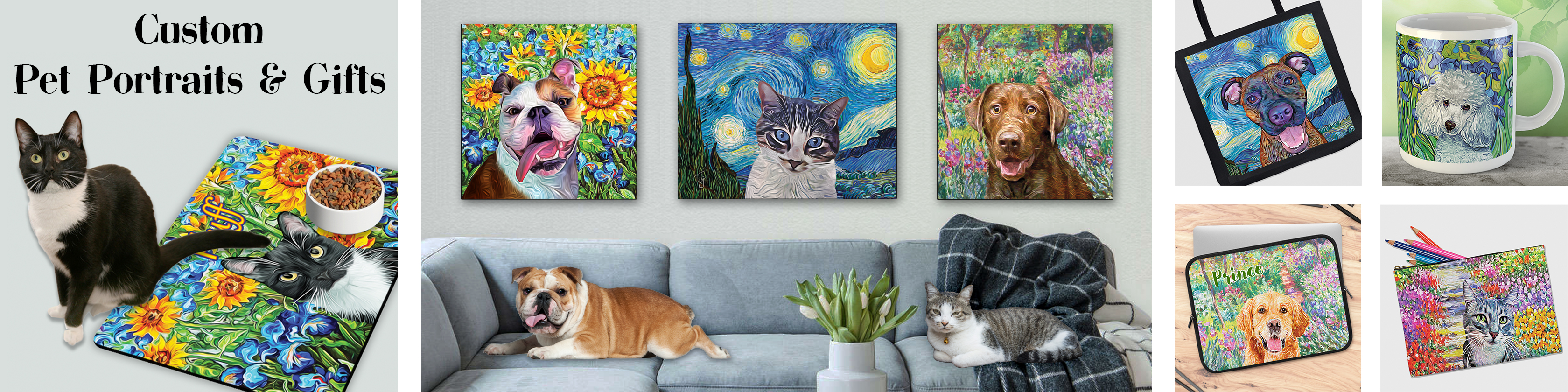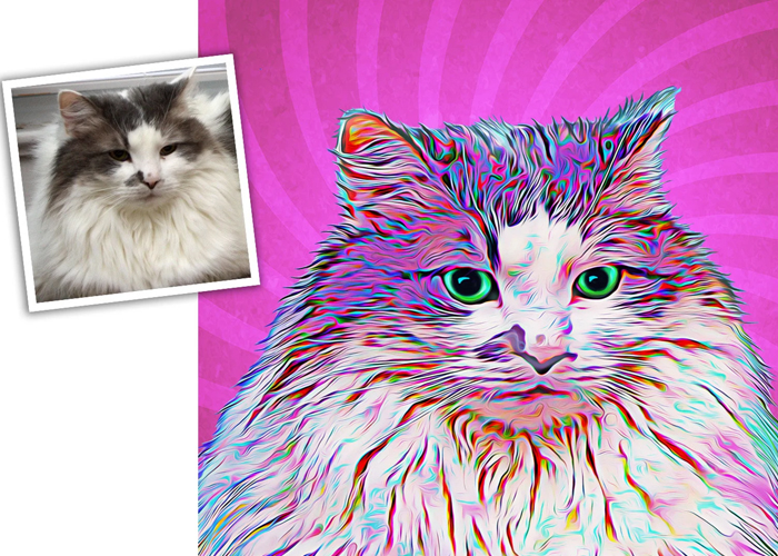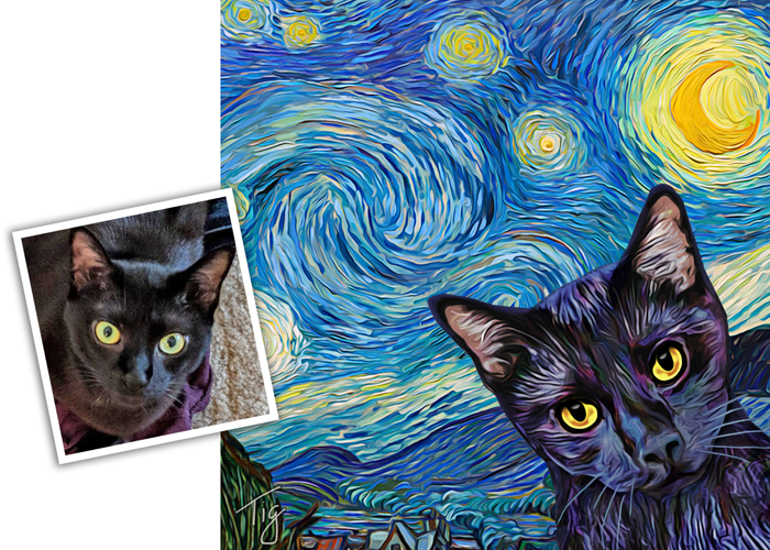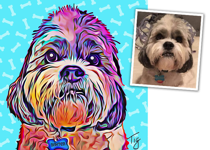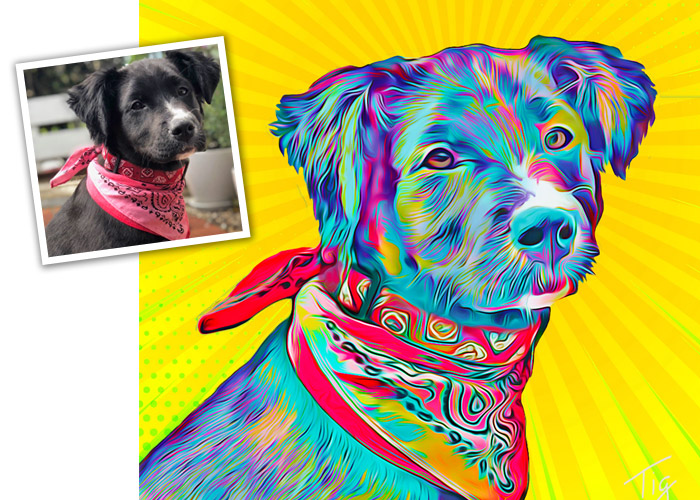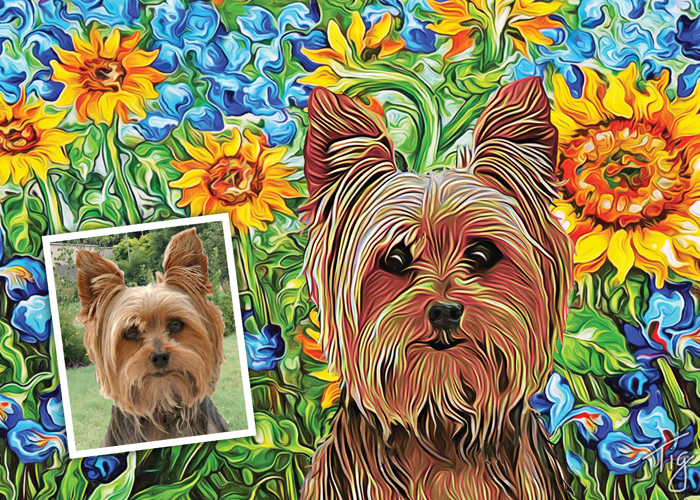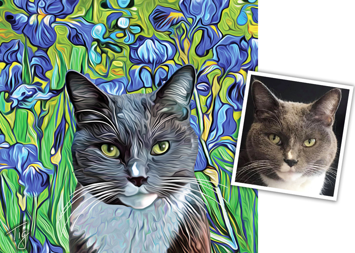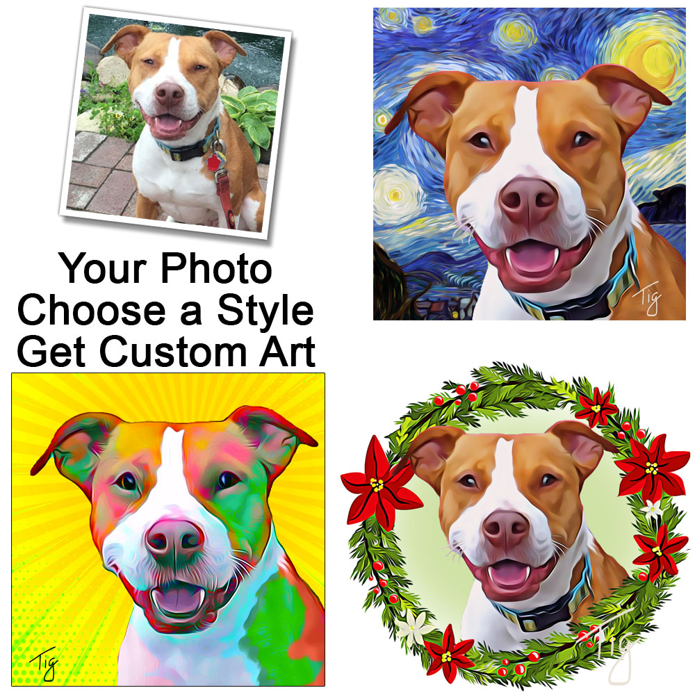 I will create an original painting of your furry, feathered, or scaley friend from your photos. I can make your art in the style of Van Gogh, Monet, colorful pop art, and more. I do the work digitally, and have it professionally printed for the best quality. You can get paper prints, canvases, tote bags, mugs, pet feeding mats and more.