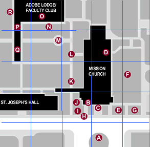 The mission is located in the center of Santa Clara University, and they happen to have a map of the mission area online. This has the current layout of the grounds, which includes part of the original buildings. As the mission has been used as a college, some modifications occurred over the years, but this map still gives valuable 'scale' information. All three of the books contained layouts of the grounds from the 1800's, although they were not identical.